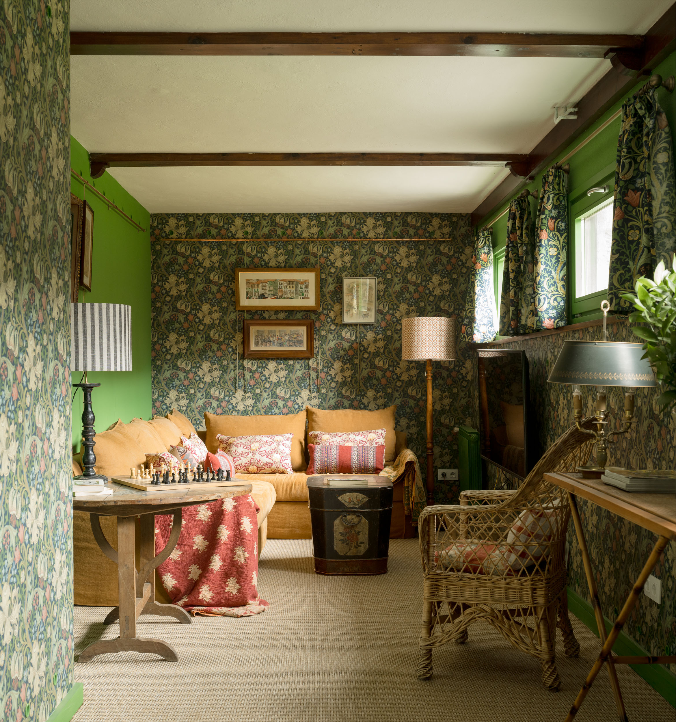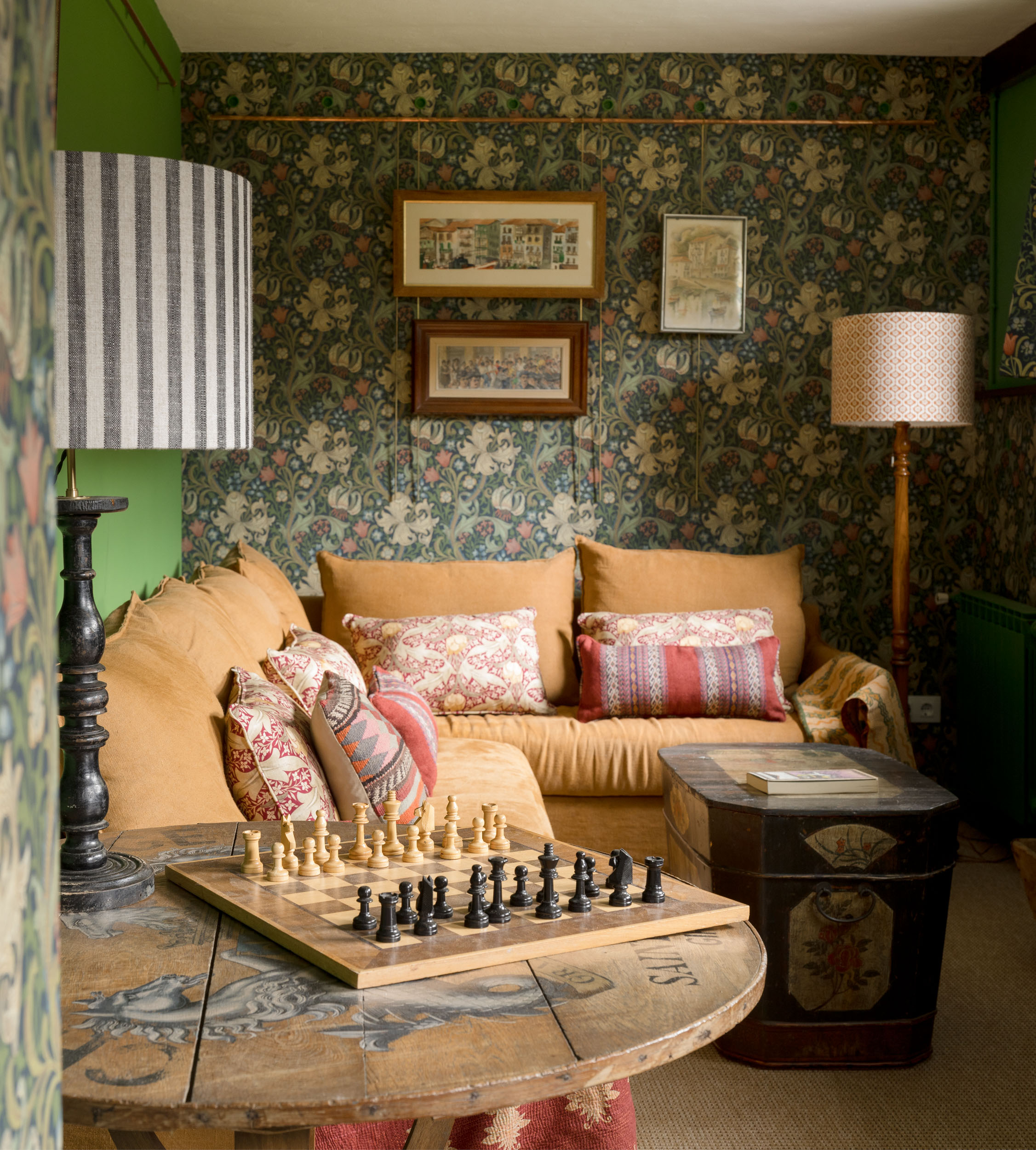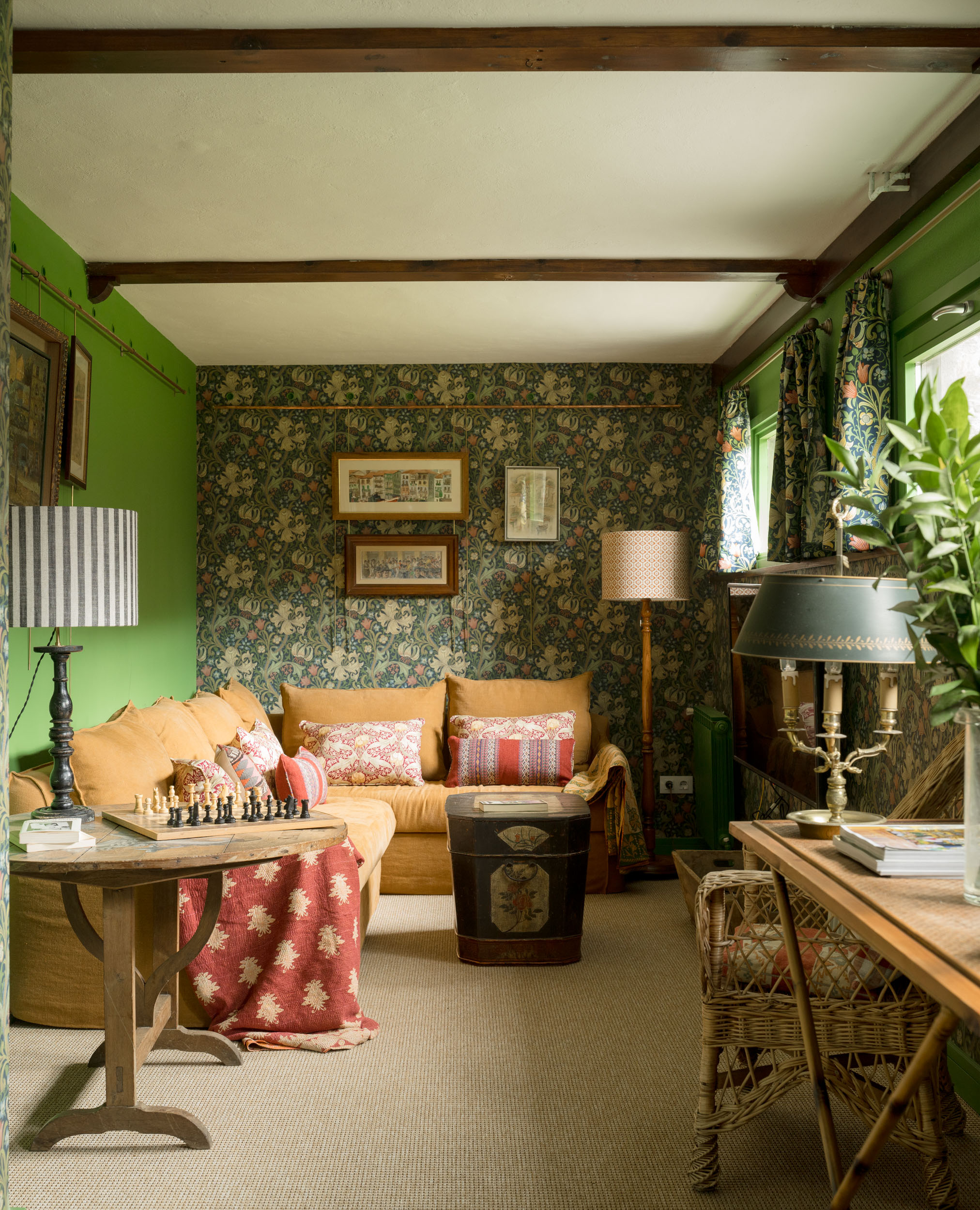 Las paredes, revestidas con papel pintado de inspiración victoriana, crean un marco visual que refuerza el aire nostálgico del espacio. Los tonos verdes profundos y los patrones florales dialogan armoniosamente con los muebles y accesorios vintage, creando un ambiente envolvente. Un sofá mostaza, adornado con cojines en tonos cálidos y patrones étnicos, invita al descanso, mientras que una mesa auxiliar redonda de madera con un tablero pintado a mano se convierte en el centro de atención, añadiendo un toque artístico y artesanal.