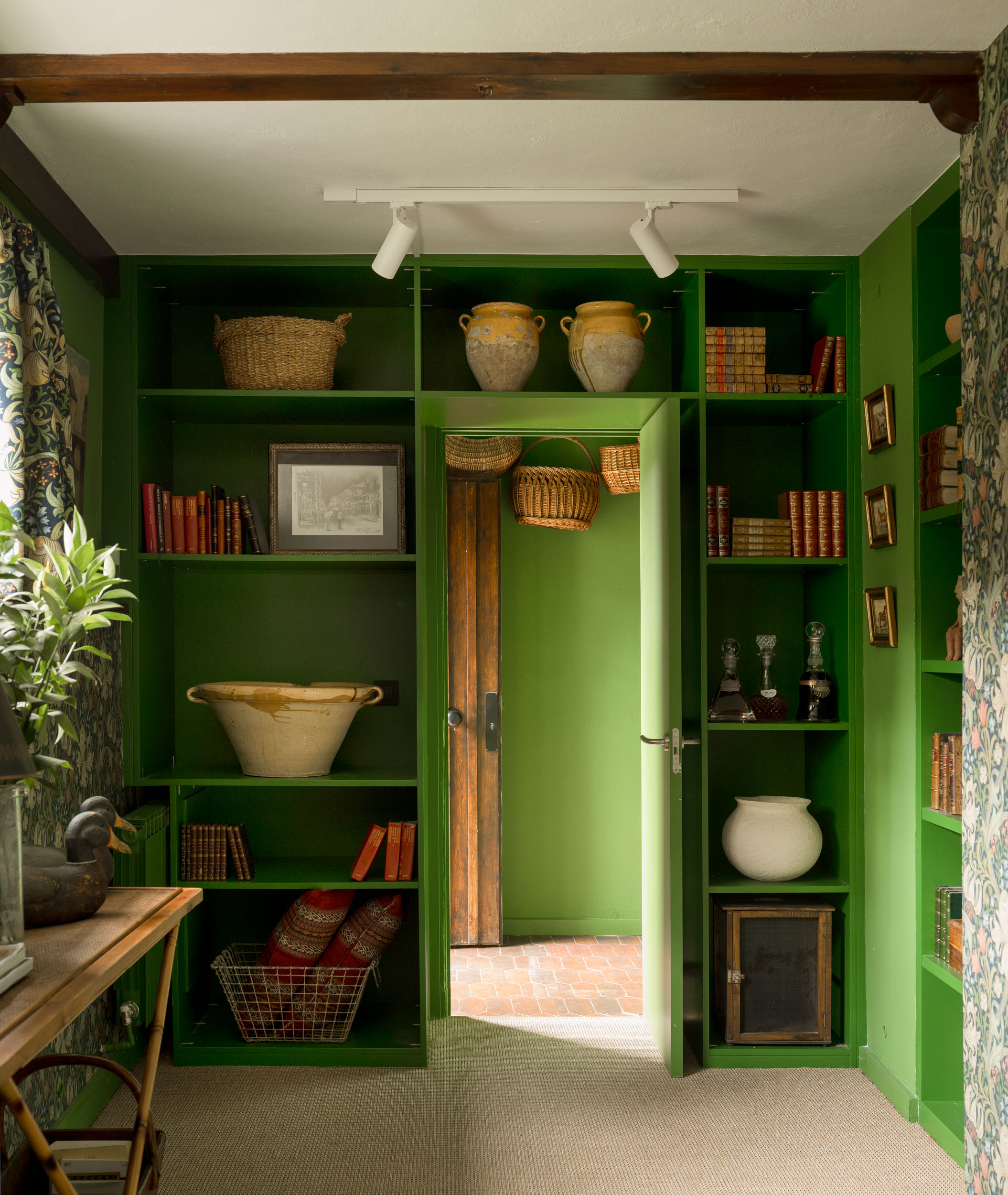 Una de las características más destacadas de este proyecto es la creación de pequeños rincones llenos de encanto. En la biblioteca del salón, los estantes pintados en verde bosque exhiben cerámica antigua, cestas de mimbre y libros cuidadosamente dispuestos. Estas piezas no solo añaden funcionalidad, sino que también cuentan historias y conectan al espacio con las tradiciones de la región.