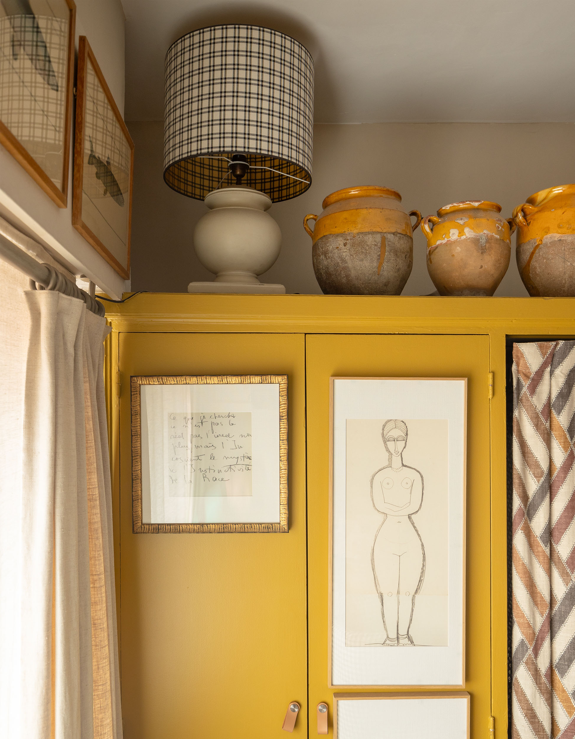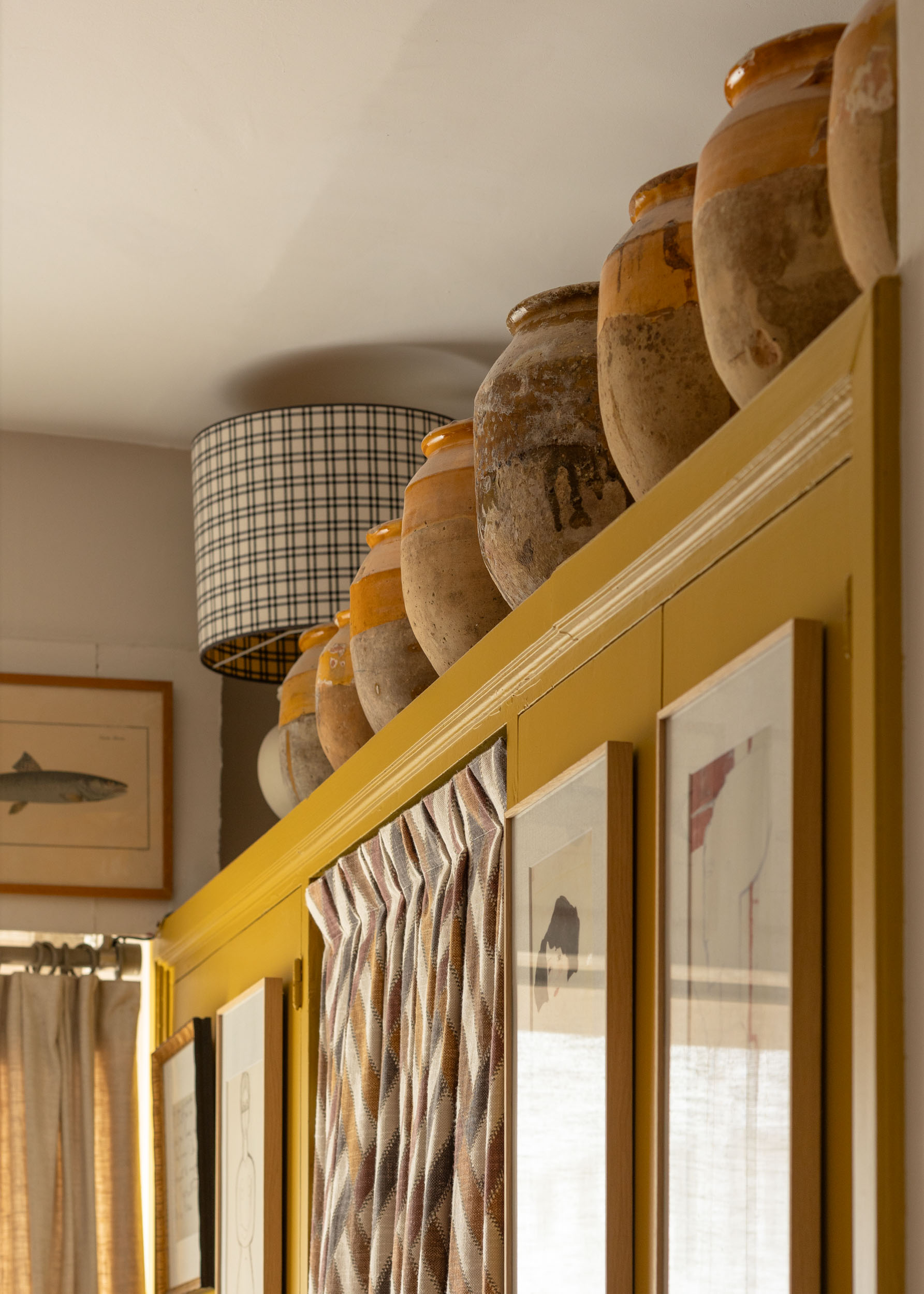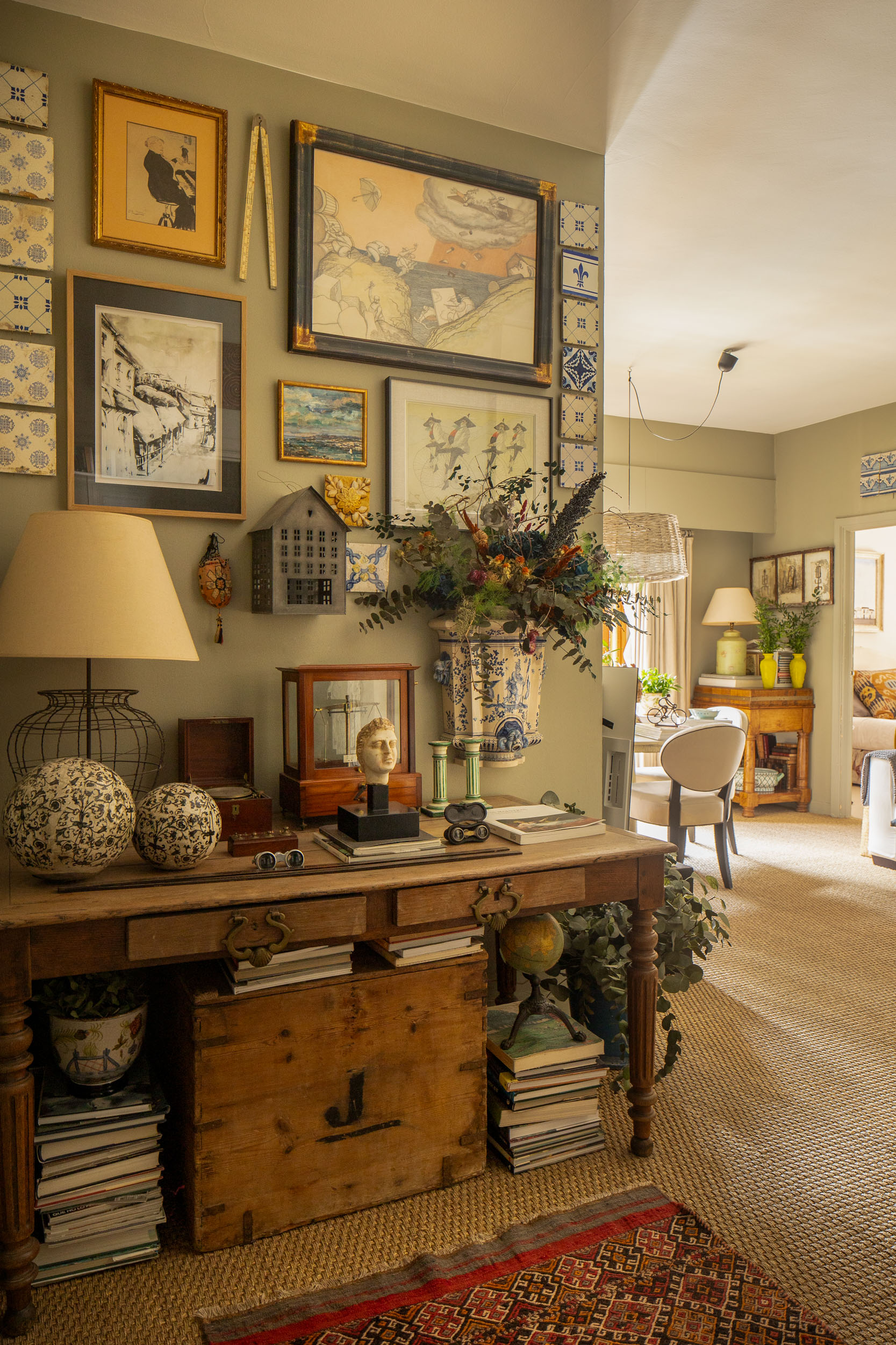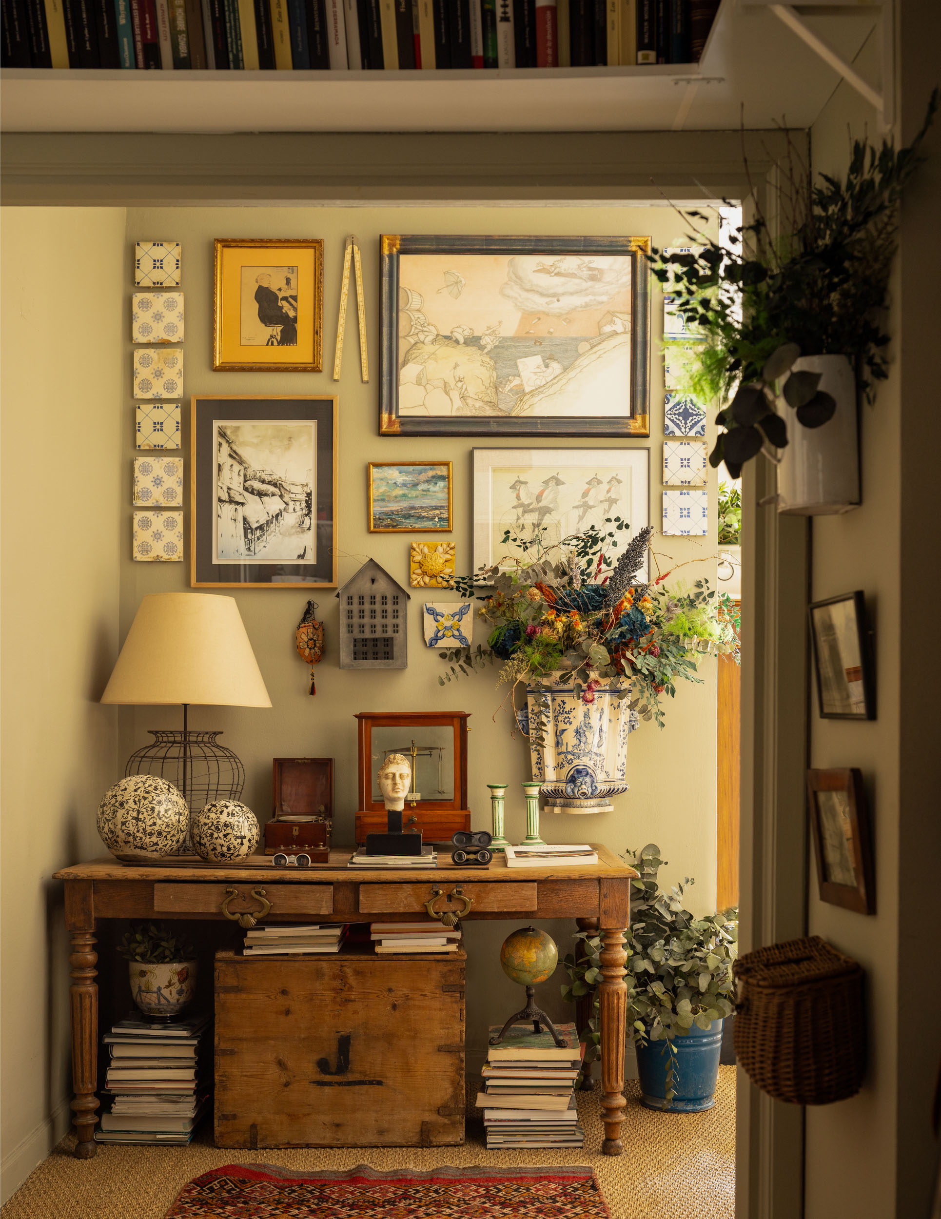 Each corner of the house reveals a meticulous attention to detail. A rustic wooden sideboard houses books and hand-painted ceramics, while a porcelain vase with dried flowers takes center stage on an entry table adorned with antiques. Shelves filled with books, artwork, and small objects add personality, showcasing an appreciation for timeless beauty.