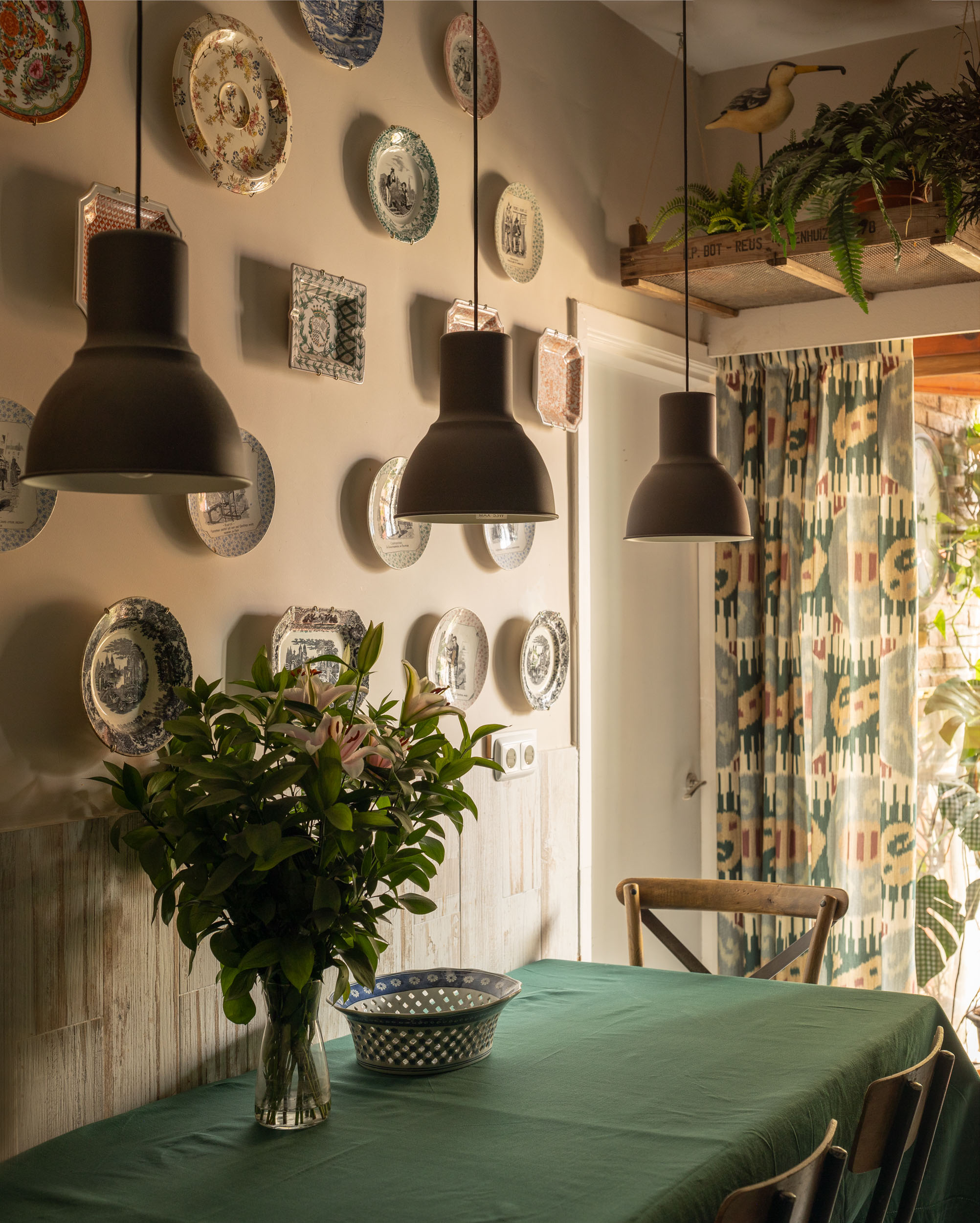 The dining room serves as a space for connection and enjoyment. Walls adorned with antique ceramic plates provide a rustic and artisanal touch. Industrial-style pendant lights add a modern contrast, harmonizing with traditional elements. Curtains featuring geometric patterns complete the setting, injecting a pop of color that enhances the warmth of the space.