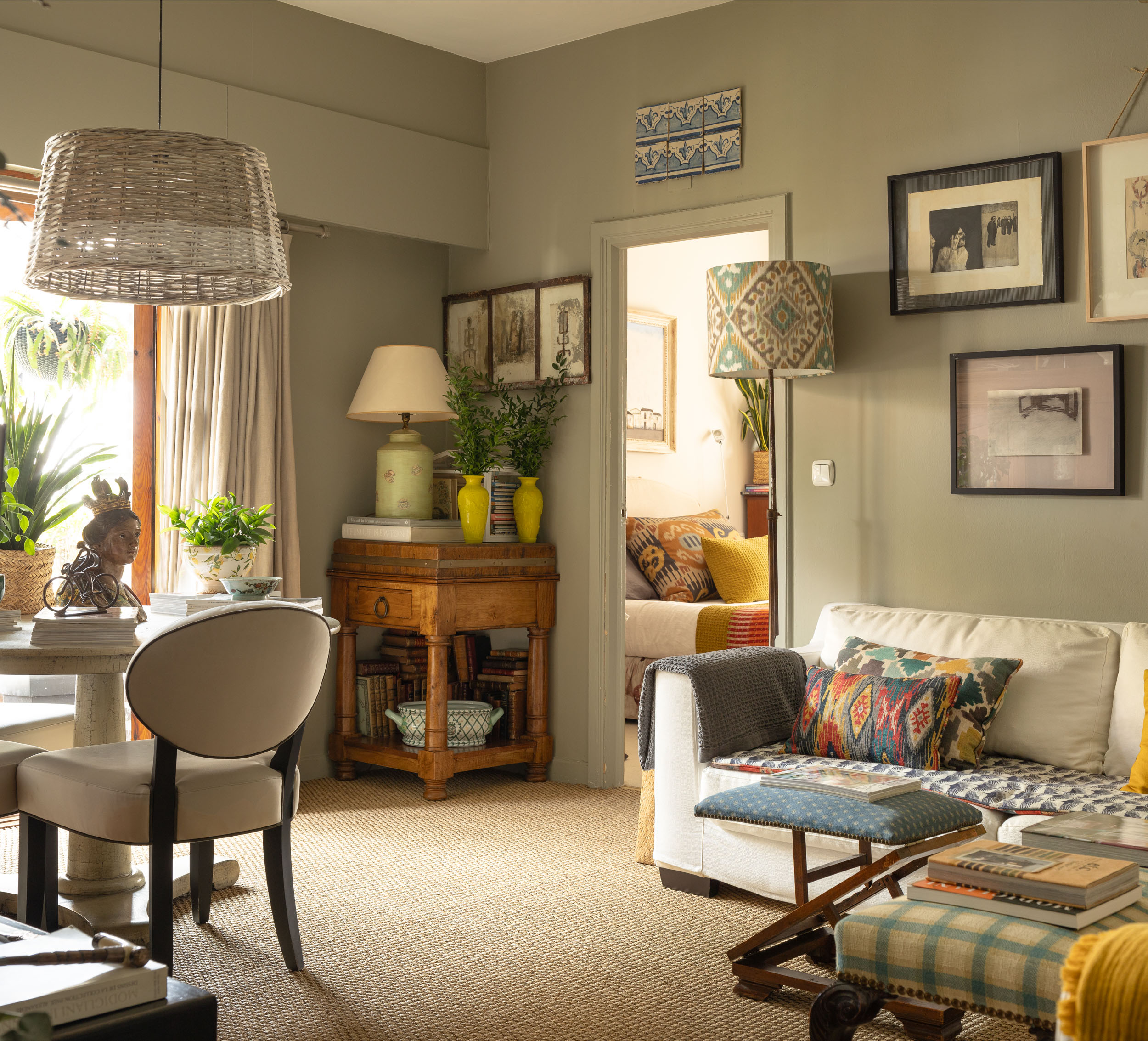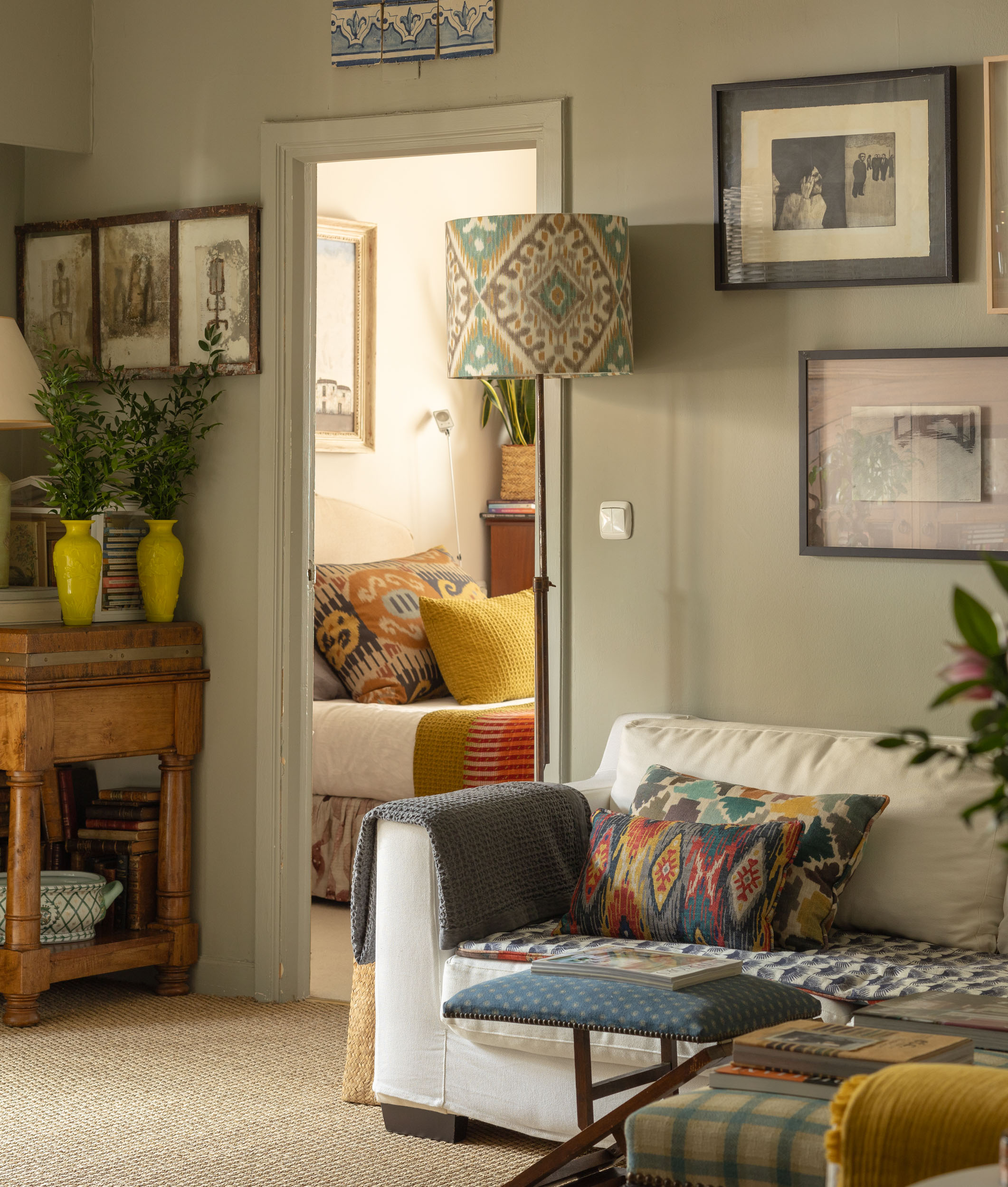 The living room, the heart of this home, features a curated blend of antique furniture and carefully selected art objects. White sofas adorned with cushions showcasing ethnic patterns and warm textures contrast beautifully with mustard and earthy tones of throws and textiles, creating an inviting and comfortable ambiance. The walls, painted in a soft green, are adorned with a gallery of vintage frames and artwork, adding depth and a visual narrative.