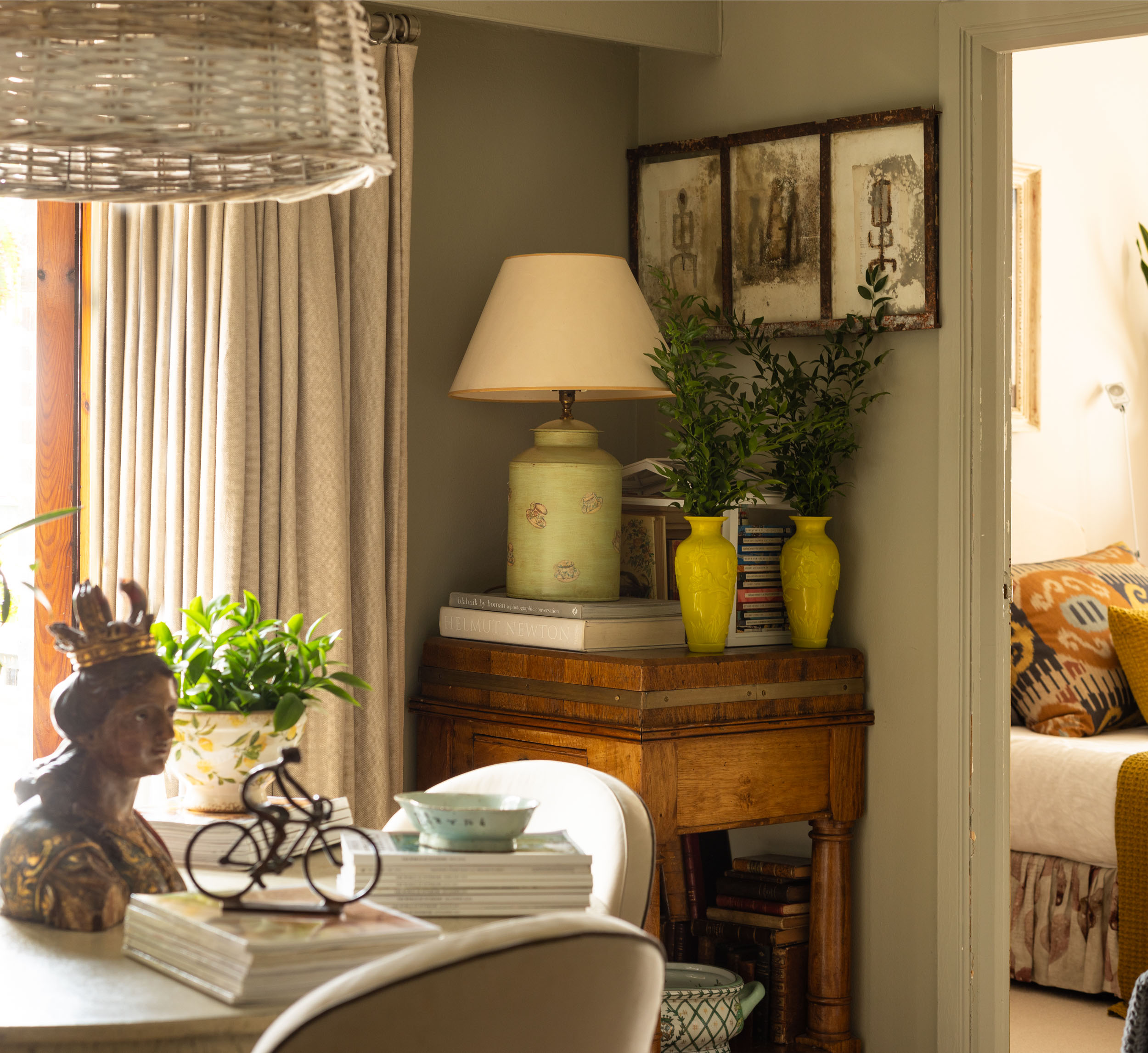 A floor lamp with an ikat fabric shade and an antique wooden side table enhance the setting, while plants introduce a refreshing connection to nature. This space reflects Deco for Curious’s philosophy: every object has a story to tell.