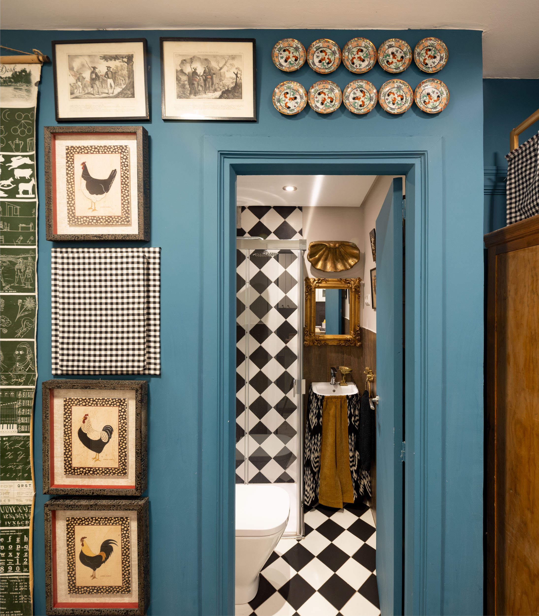 Deep blue walls contrast against a black-and-white checkered tile floor, creating a sophisticated ambiance with a nod to the past. Decorative plates and framed artwork bring personality, transforming the bathroom into more than just a functional space.