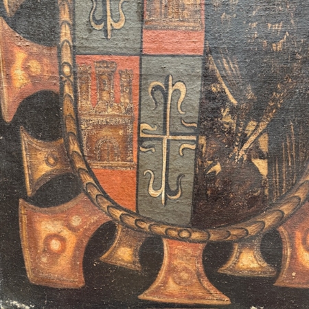 Some pieces arrive carrying a quiet kind of weight — the sort that only centuries can give. This 17th-century heraldic canvas, a Colonial School coat of arms painting, has that presence: time resting on its surface like a thin layer of dust that refuses to be brushed away.