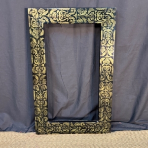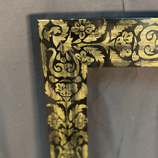 This antique frame stands out with its deep black finish, richly decorated with classical-inspired gold floral motifs that run along the entire moulding, creating an intense and elegant ornamental effect.