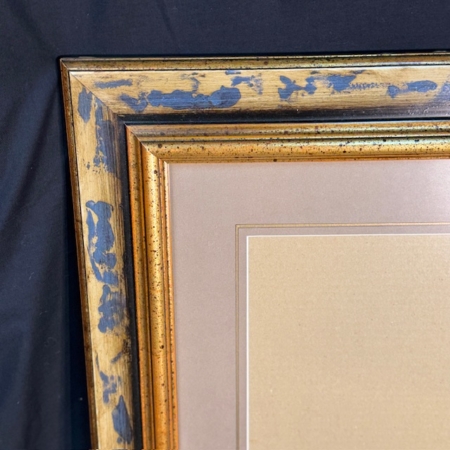 This frame does not seem made to draw attention, but to hold it. At first glance it is restrained; on closer inspection, its balance is revealed. The outer moulding retains traces of bluish patina and aged gilding—clear marks of time and use, not artifice. The inner edge, more contained, guides the eye toward the mat with a gentle, almost silent transition.