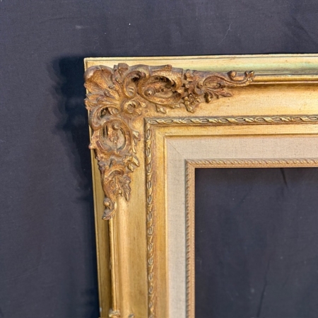 This antique frame stands out for its finely carved rocaille ornamentation, positioned at the four corners and at the center of each side, creating a balanced and harmonious decorative rhythm. The aged gold finish, with soft patina and light wear, adds depth and an appealing historic character.