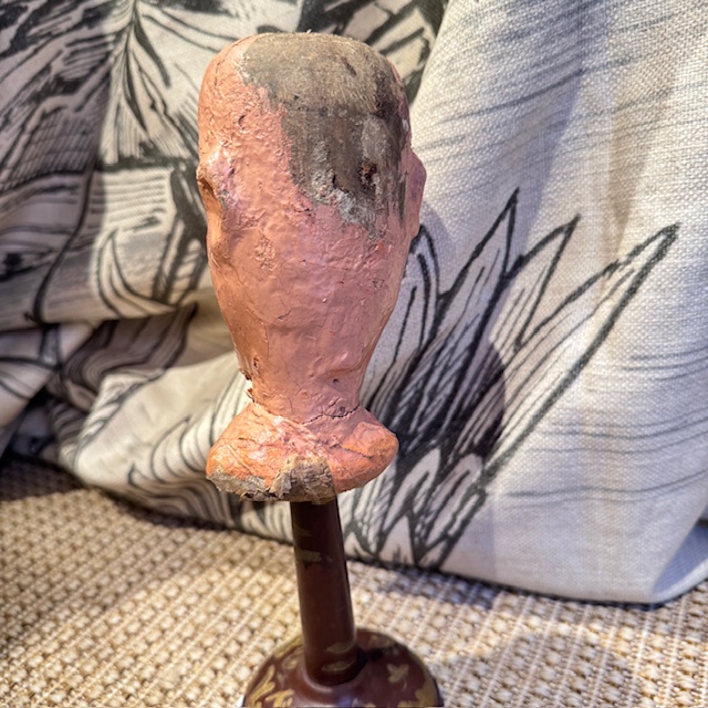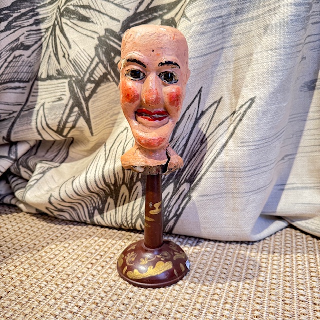 The puppet head in question—carved in wood, modelled in plaster and hand-painted—belongs to that vibrant universe. Its glass eyes, flushed cheeks and exaggerated smile are signature features of Punch & Judy characters, where the grotesque and the comic coexisted with total naturalness.