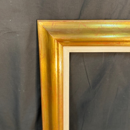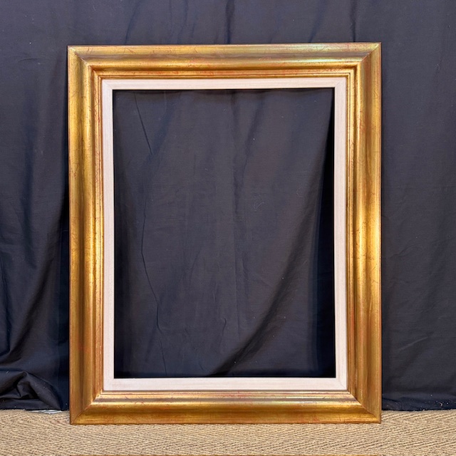 This antique frame is crafted in wood with a warm gold finish, enriched by an aged patina that adds depth and character. Its wide moulding, with a gently curved classic profile, gives it a solid and balanced presence—ideal for enhancing medium to large-format works.