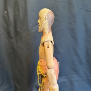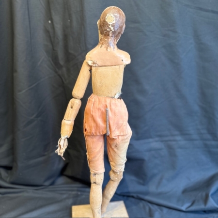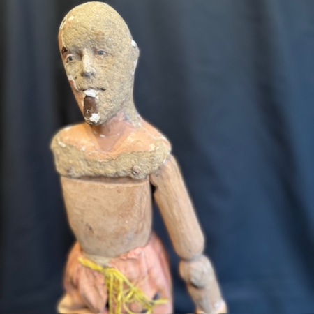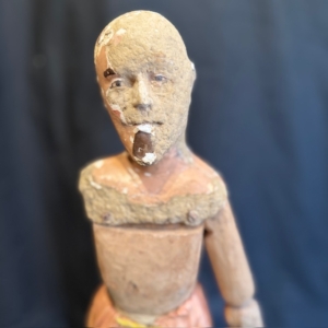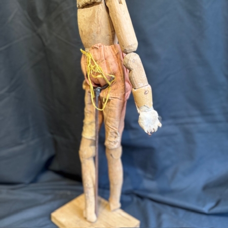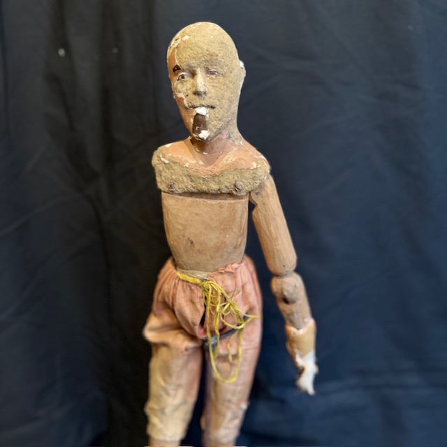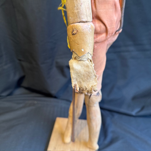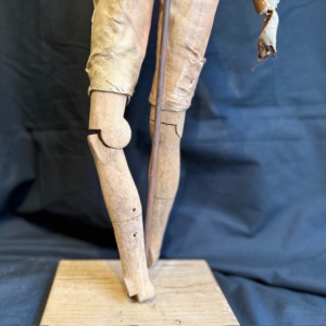 This figure features a traditional artisanal construction, with a polychrome papier-mâché head and an articulated wooden body—a system that allowed for adjusting its posture and adapting it to different scenographic or decorative uses.