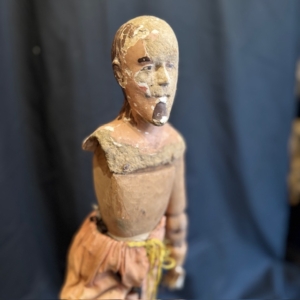 Overall, this is a piece with strong expressive character and sculptural presence, where the combination of materials—papier-mâché, wood, and textiles—creates an object rich in memory and aesthetic value, ideal for collectors or for integration into interiors with historical sensitivity.