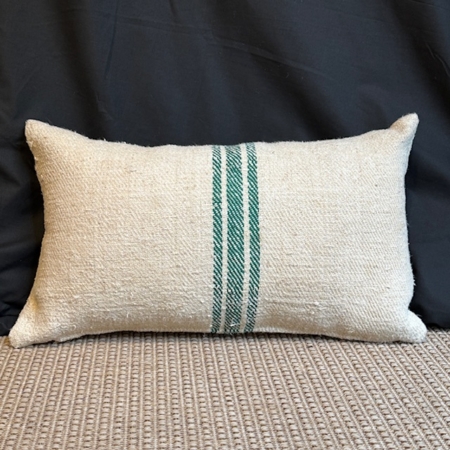 This cushion is crafted from vintage Slovak fabric from the 1950s, a textile that reflects the Central European weaving tradition of the mid-20th century. Its design features a natural, off-white ground crossed by green vertical stripes that introduce visual rhythm and a calm, balanced contrast.
