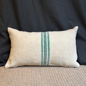 This cushion is crafted from vintage Slovak fabric from the 1950s, a textile that reflects the Central European weaving tradition of the mid-20th century. Its design features a natural, off-white ground crossed by green vertical stripes that introduce visual rhythm and a calm, balanced contrast.
