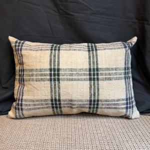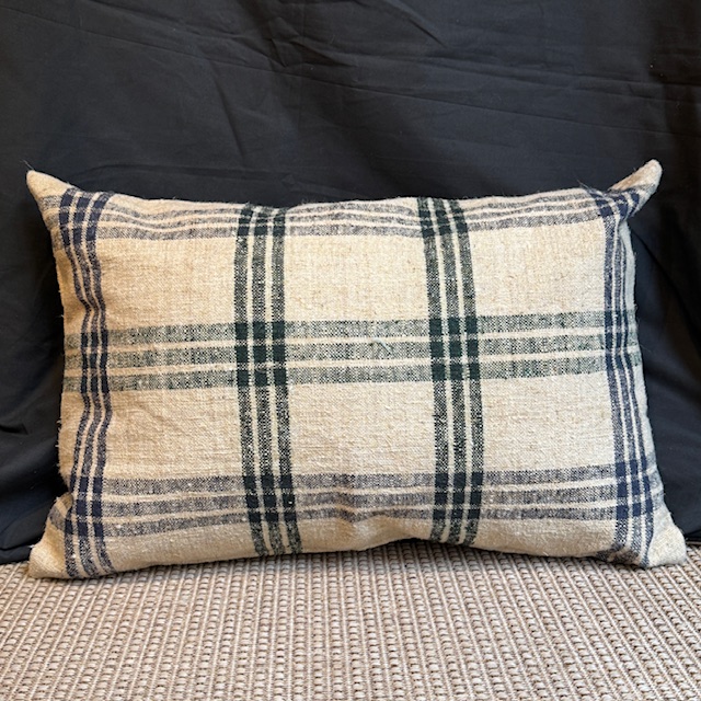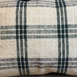This cushion is crafted from vintage Slovak fabric dating from the 1950s, a textile that reflects the Central European weaving tradition of the mid-20th century. Its checked pattern in natural tones and blue-grey hues achieves a perfect balance between simplicity and character, making it easy to integrate into a wide range of interior styles.