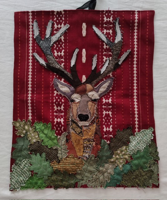 This stag by Pili Iglesias brings an imagined autumn: leaves stitched one by one, fabric scraps that recall old coats and worn textiles, and a deep red backdrop that could belong to an antique loom or the glow of a fireplace in a countryside home.