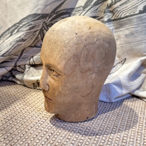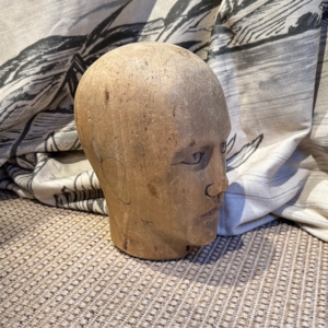 Millinery heads have always lived somewhere between tool and sculpture. This one, in particular, suggests a different past from the first head: perhaps it belonged to a workshop where the hats were more experimental, or maybe it accompanied an apprentice learning how to measure proportions and fabric tension. No one can say for sure, but that uncertainty is part of its charm.