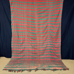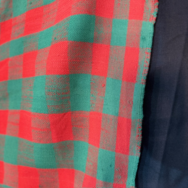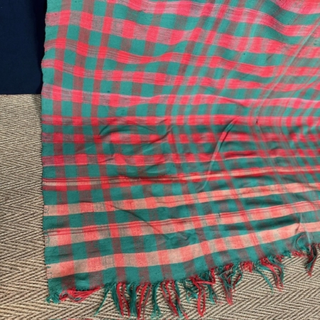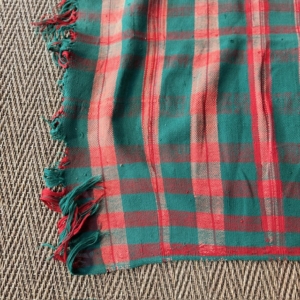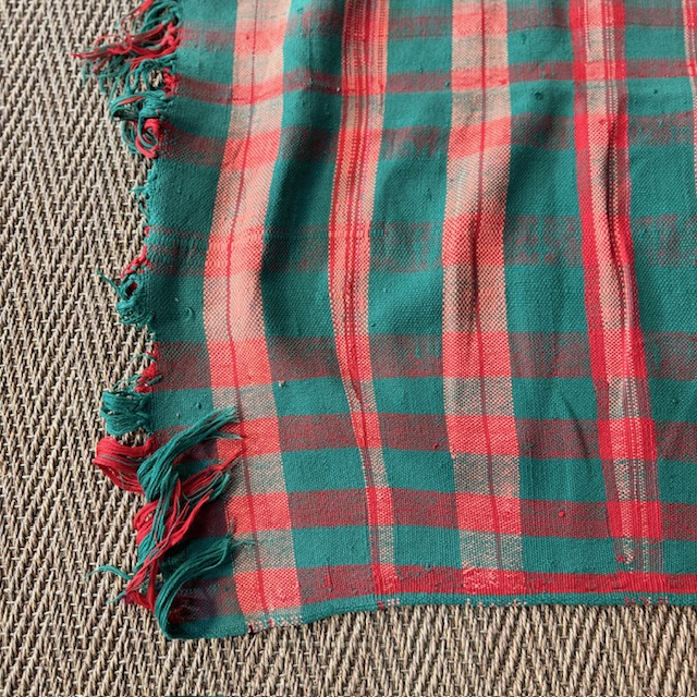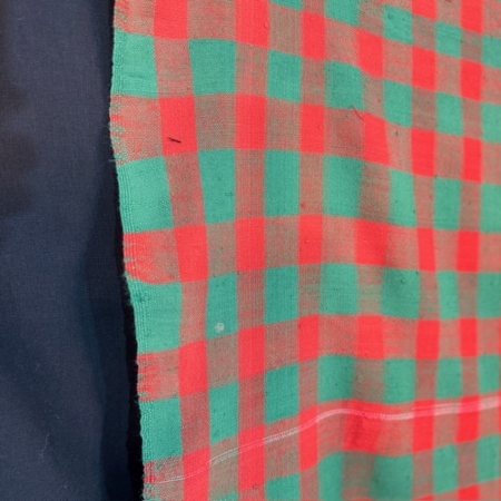 The red and green check pattern creates a vibrant yet balanced visual rhythm. The geometric repetition recalls traditional utilitarian fabrics, while the slight irregularities of the weave reveal its handcrafted character and authenticity.