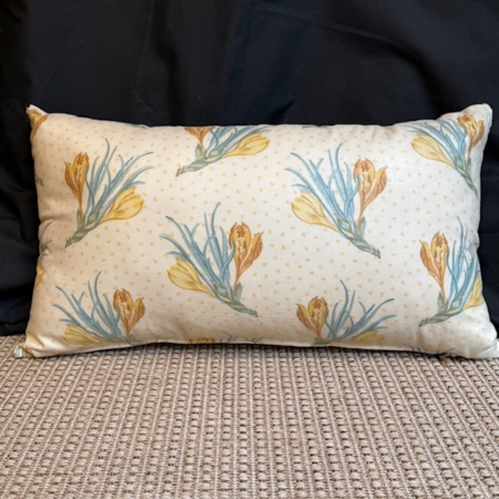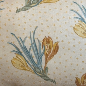 Este cojín está realizado a partir de un retal auténtico de algodón chintz vintage de la firma inglesa Colefax & Fowler, casa textil fundada en el Reino Unido y reconocida internacionalmente por sus tejidos decorativos de inspiración clásica. El diseño, datado a finales del siglo XX, presenta delicados crocus amarillos distribuidos sobre un fondo claro salpicado de pequeñas hojas trébol en tono amarillo, una composición floral fresca y equilibrada.