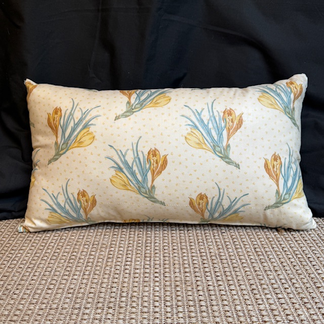 Este cojín está realizado a partir de un retal auténtico de algodón chintz vintage de la firma inglesa Colefax & Fowler, casa textil fundada en el Reino Unido y reconocida internacionalmente por sus tejidos decorativos de inspiración clásica. El diseño, datado a finales del siglo XX, presenta delicados crocus amarillos distribuidos sobre un fondo claro salpicado de pequeñas hojas trébol en tono amarillo, una composición floral fresca y equilibrada.