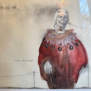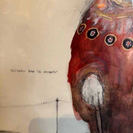 En esta obra titulada Disfraz para una gran ópera, José Luis Serzo presenta una figura solitaria, casi suspendida en un espacio indefinido, vestida con un llamativo traje rojo que recuerda al vestuario escénico de un personaje teatral. El dibujo, realizado principalmente en grafito y color, combina delicadeza en el trazo con una presencia cromática intensa que centra la atención en el personaje.