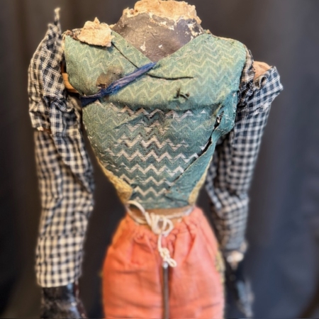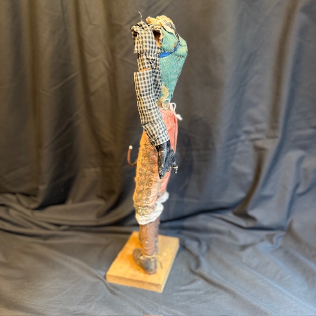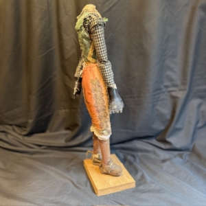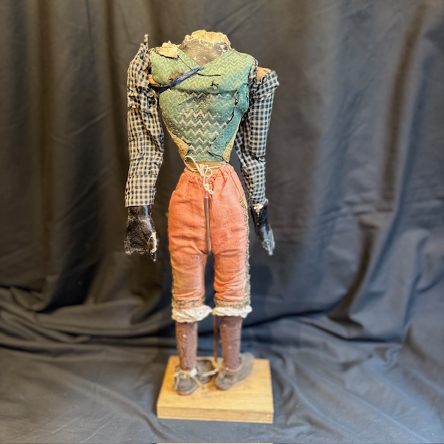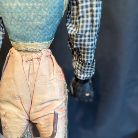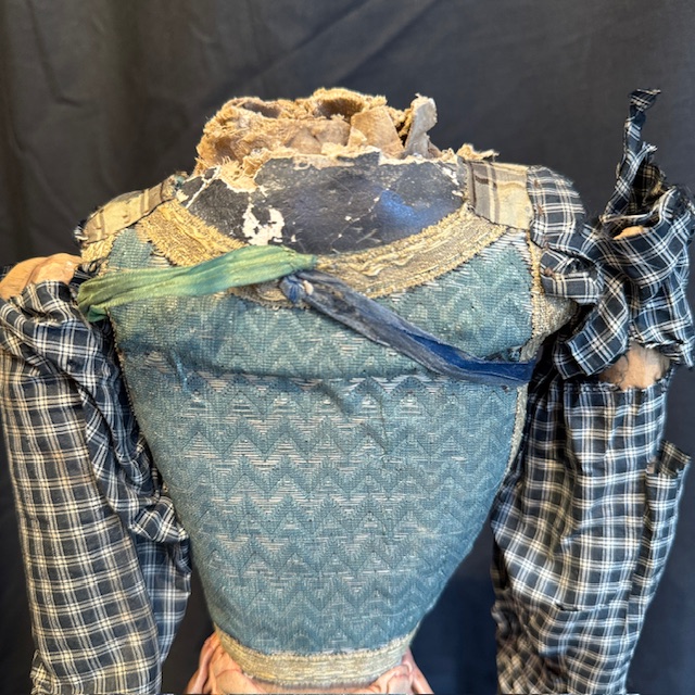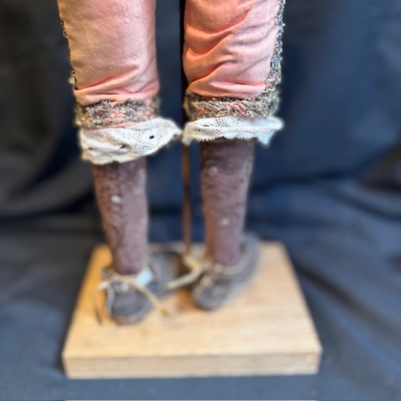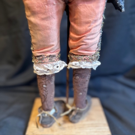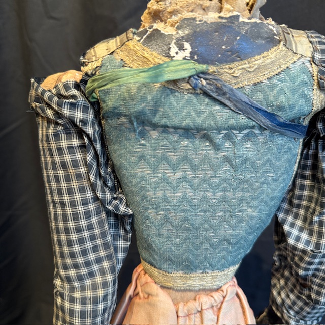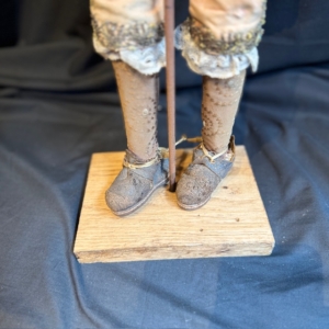 La vestimenta conserva tejidos antiguos, con combinación de texturas y patrones —chaleco en tonos verdosos, mangas a cuadros y pantalón claro— que evidencian un notable desgaste, aportando autenticidad y una pátina propia del paso del tiempo. Los pequeños detalles textiles, como encajes y costuras, reflejan un trabajo manual minucioso.