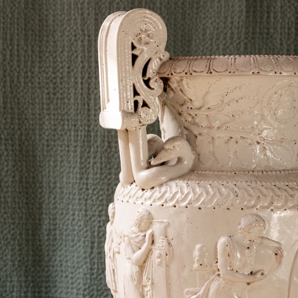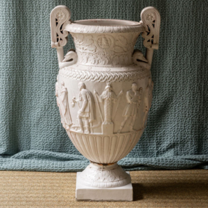 Jarrón tipo ánfora XXL con motivos mitológicos. Porcelana blanca con transparencia rosa. Jarrón muy decorativo para poner en una peana o en una esquina.