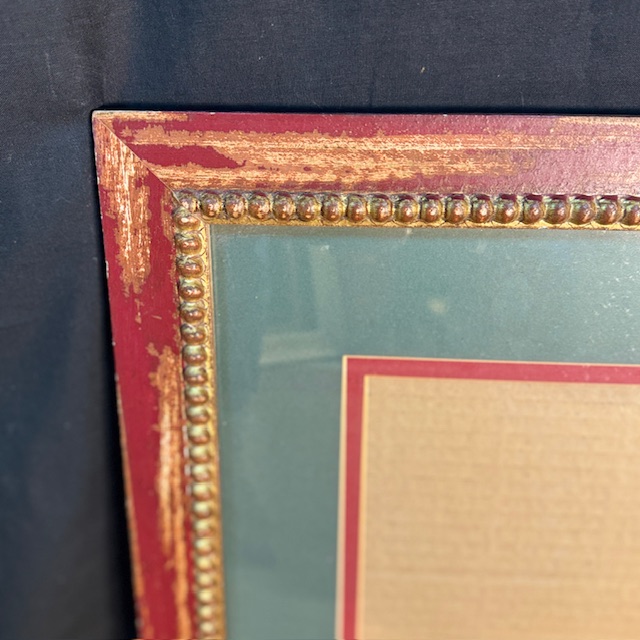 En el interior, una moldura de cuentas doradas —regular, casi rítmica— marca la transición hacia el paspartú en verde grisáceo y rojo. La combinación no es casual. Remite a interiores donde el color se utilizaba para crear profundidad y contraste, no solo para acompañar una obra sino para construir una escena completa en la pared.