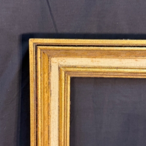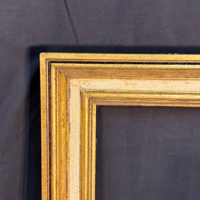 La doble moldura introduce una lectura en capas: primero el blanco roto, ligeramente apagado, casi como un margen dibujado con lápiz; después el dorado, aplicado sin brillo excesivo, con una pátina que suaviza cualquier gesto grandilocuente. No hay contraste brusco, sino transición. Algo muy propio de marcos diseñados para durar más que las modas.