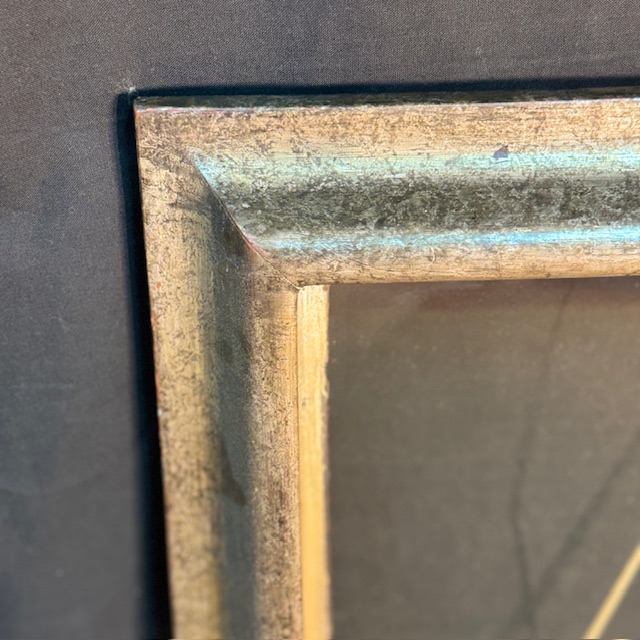 Su acabado plateado envejecido no busca brillar: más bien acompaña. La madera deja entrever el paso del tiempo en pequeños matices, en zonas donde la pátina se suaviza y el color se vuelve más profundo, casi táctil. No es un plateado frío ni uniforme, sino uno trabajado, con memoria.